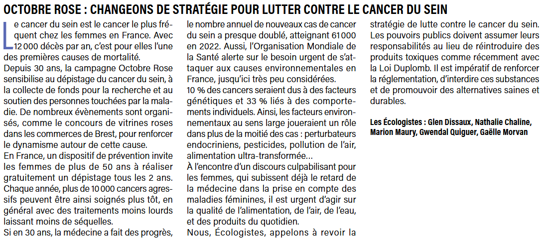Nous, Écologistes, appelons à revoir la stratégie de lutte contre le cancer du sein. Les pouvoirs publics doivent assumer leurs responsabilités au lieu de réintroduire des produits toxiques comme récemment avec la Loi Duplomb. Il est impératif de renforcer la réglementation, d’interdire ces substances et de promouvoir des alternatives saines et durables.